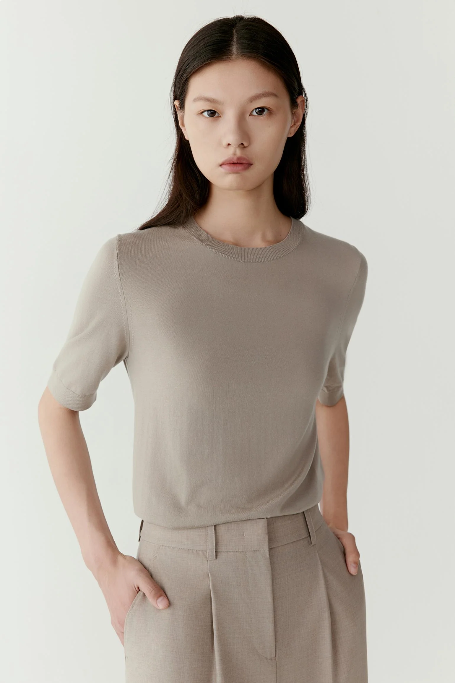 Ce t-shirt en maille taupe est confectionné en laine légère lavable en machine.
