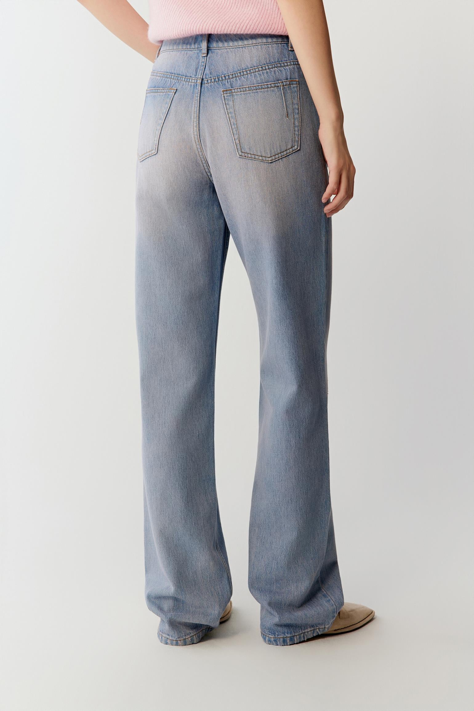 Confectionné en denim de coton naturel, ce jean droit présente une texture douce et des lignes épurées. Le bleu clair, légèrement nuancé de rose, apporte une luminosité naturelle à la silhouette.